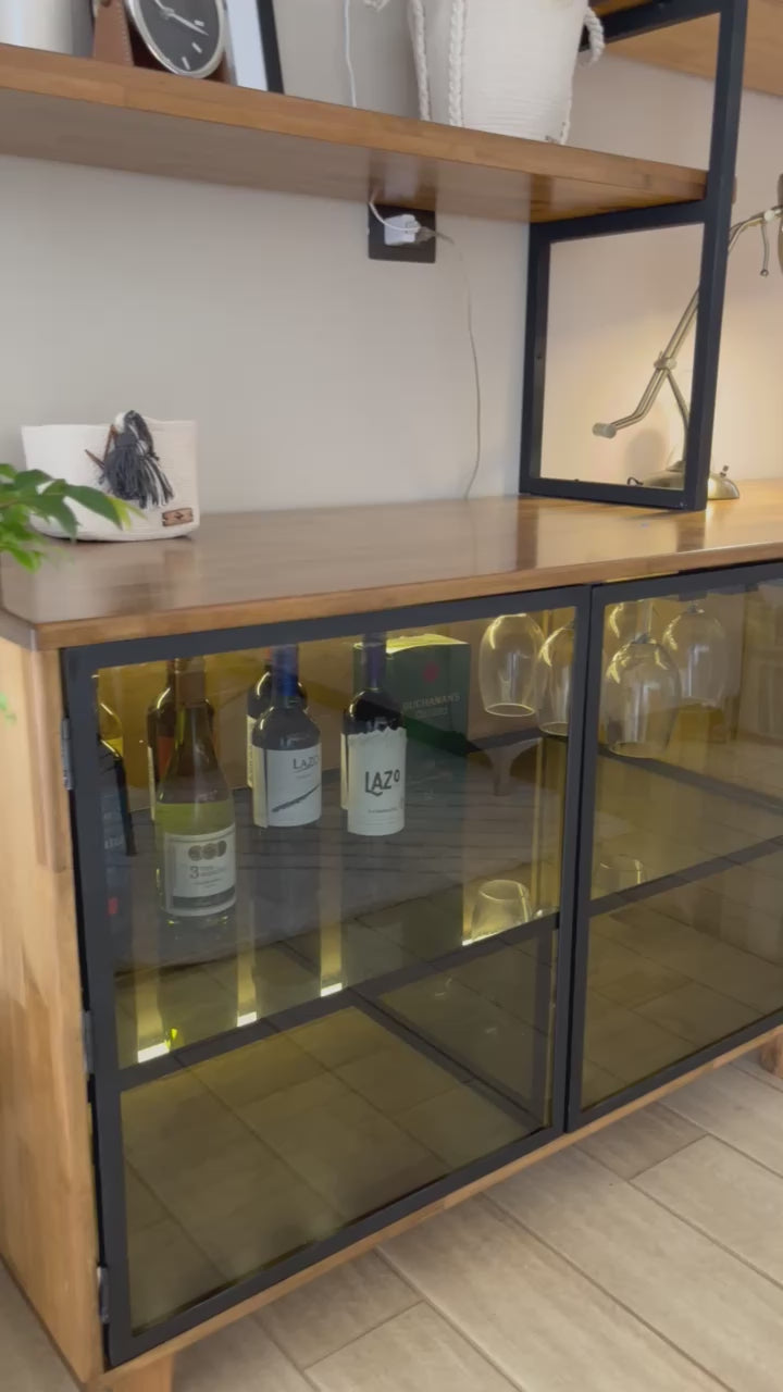 2. El bar incluye dos soportes para colgar copas, iluminación LED cálida con interruptor oculto y tres divisiones internas con vidrio negro.